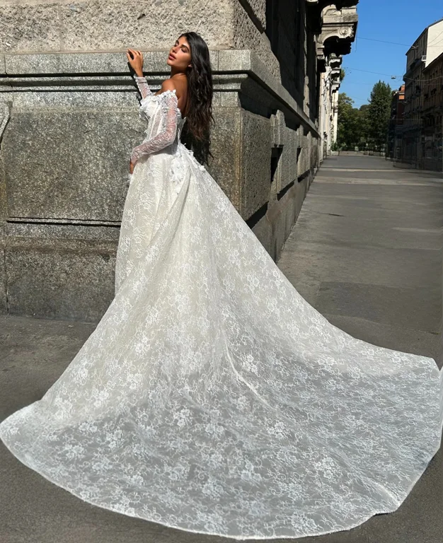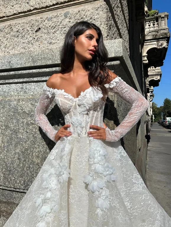 Amelia Bridal Gown — A romantic off-the-shoulder corset wedding dress with illusion lace sleeves and a voluminous lace overskirt. Adorned with 3D floral appliqués.