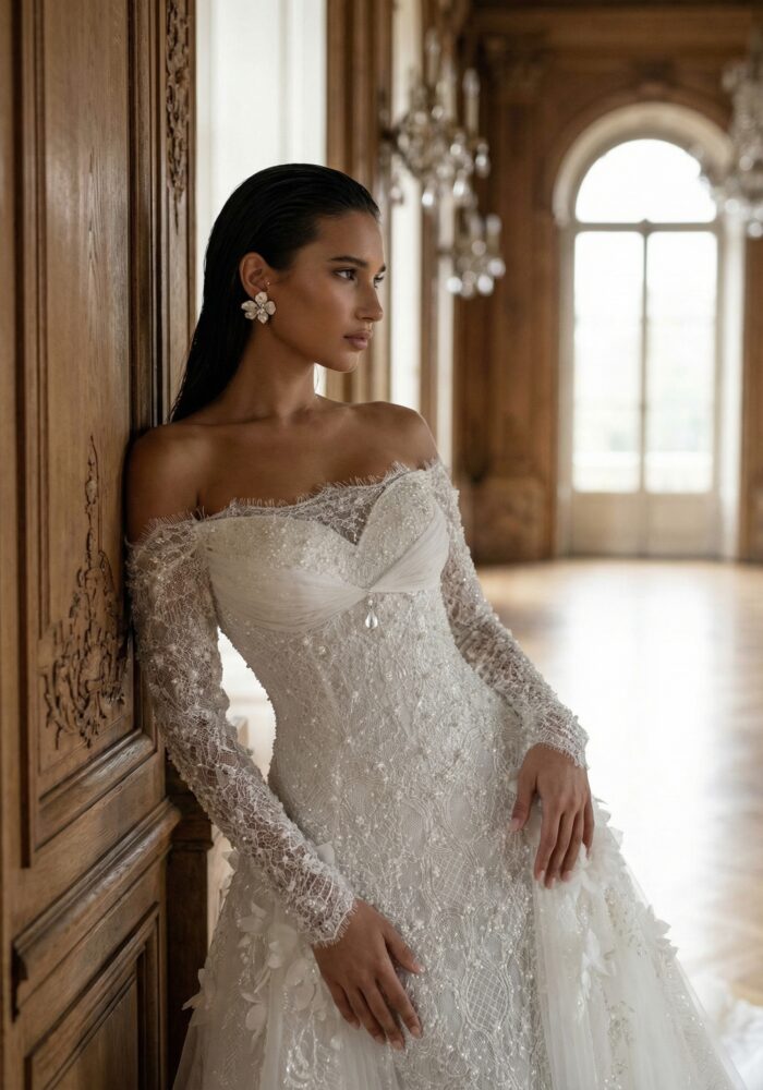 Aurelia embraces the feminine silhouette, reflecting a divine presence. Elevated by dramatic, curtain-like layers that evoke an air of divinity, where classical grace meets modern-day beauty.