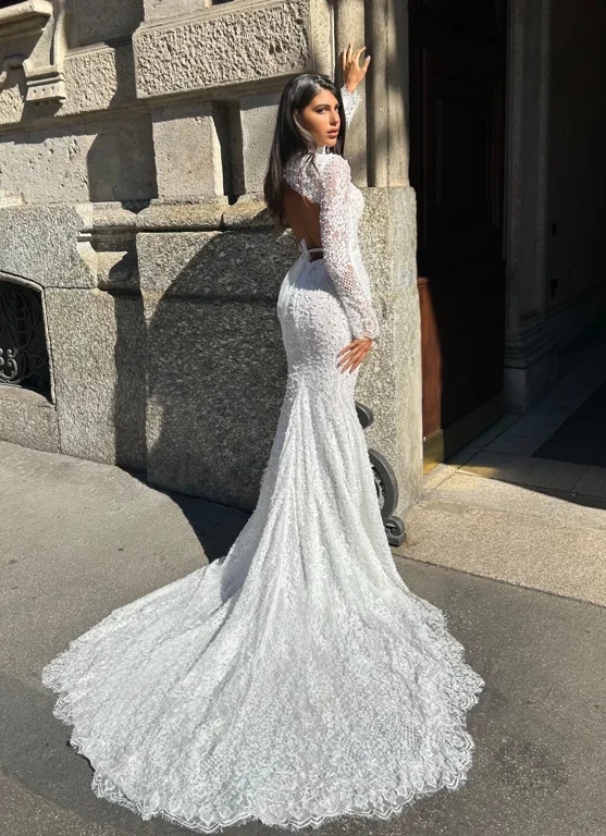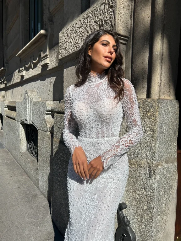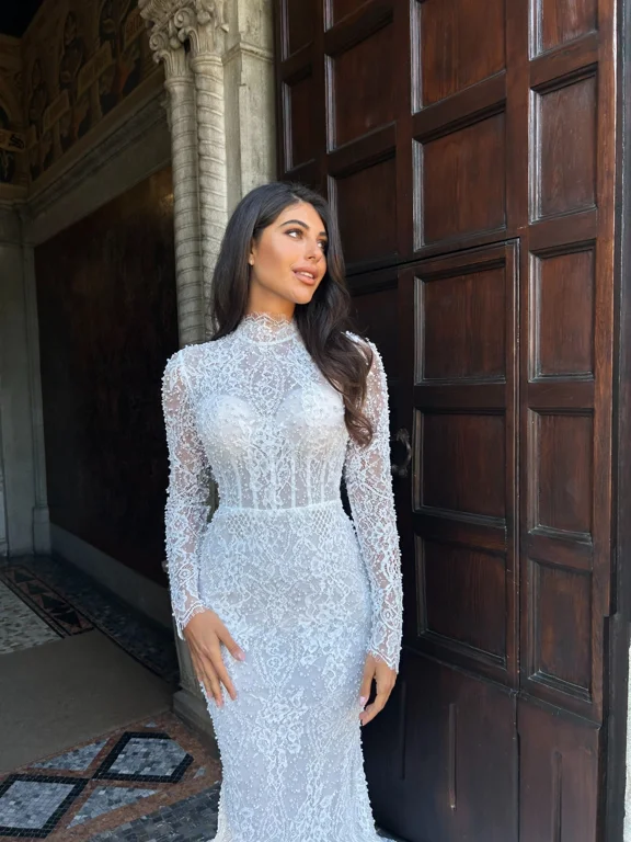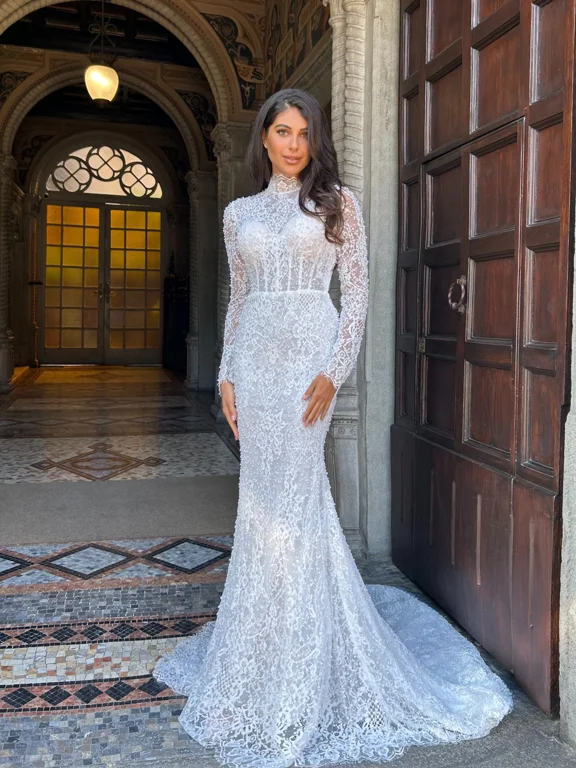 Monique Bridal Gown — A sophisticated high-neck lace wedding dress with a fitted mermaid silhouette and long illusion sleeves. The gown’s delicate lace pattern and subtle corset detailing create a refined, elegant look perfect for brides who value timeless beauty with modern grace.