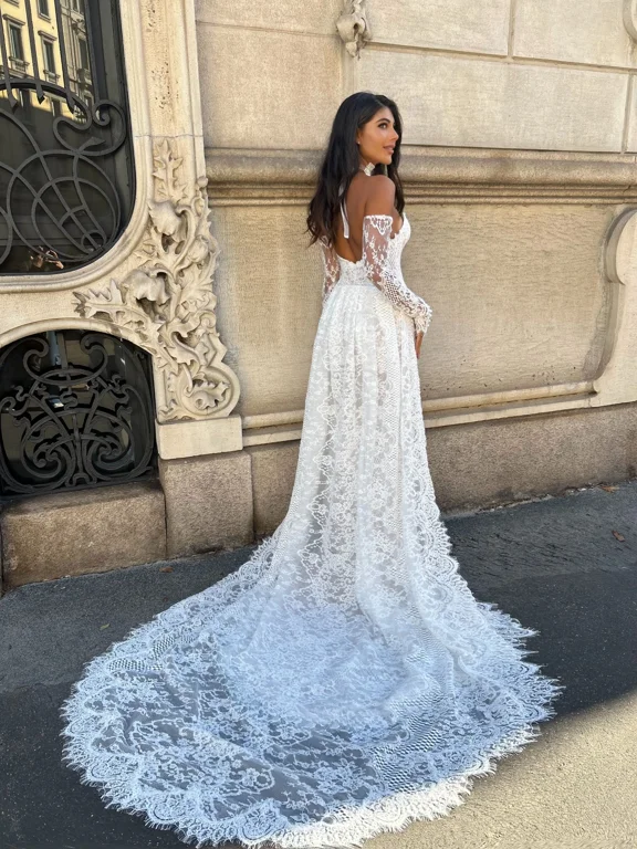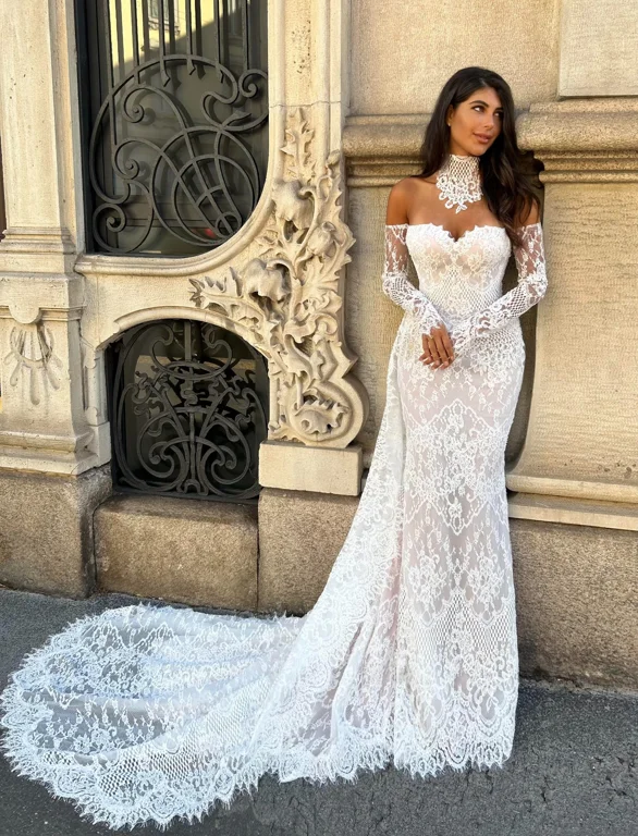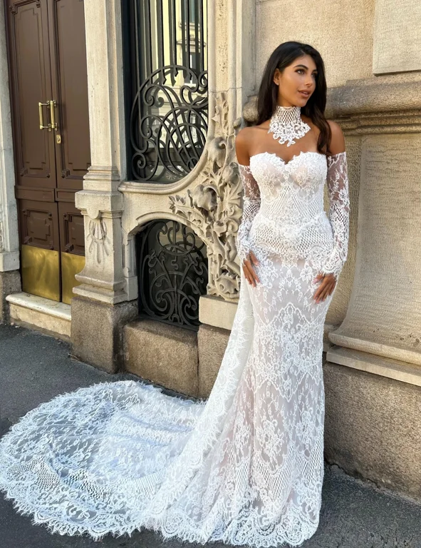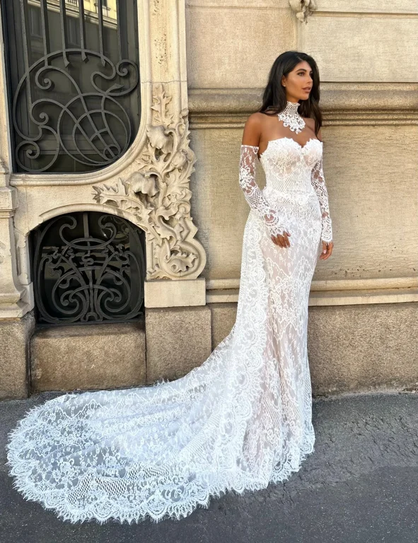 Sirena- a striking lace mermaid wedding dress with a dramatic cathedral train. The intricate lace detailing sculpts the silhouette beautifully, while the detachable high-neck choker accent adds a couture touch. Sirena is made for the confident bride who wants to embody both sensuality and timeless elegance.