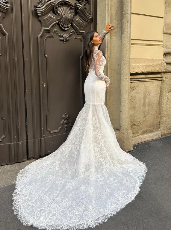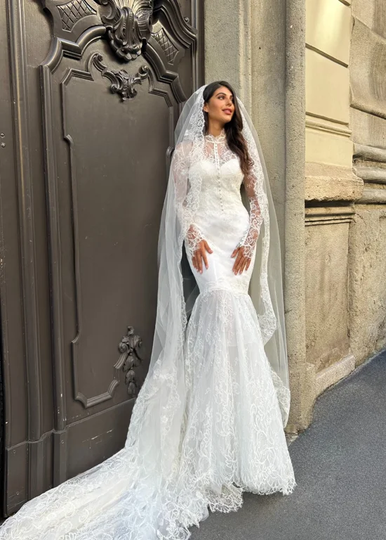 Sara Bridal Gown — An elegant lace mermaid wedding dress with a high illusion neckline, long sleeves, and a graceful cathedral train. The delicate buttoned back and sheer lace detailing exude sophistication, making Sara the perfect choice for the bride who values refined beauty and timeless charm.