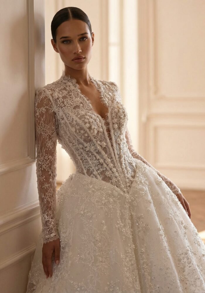 Classical and cinematic in mood. Sets the tone with a refined presence. Delicate bodice and defined waist create a statuesque silhouette.