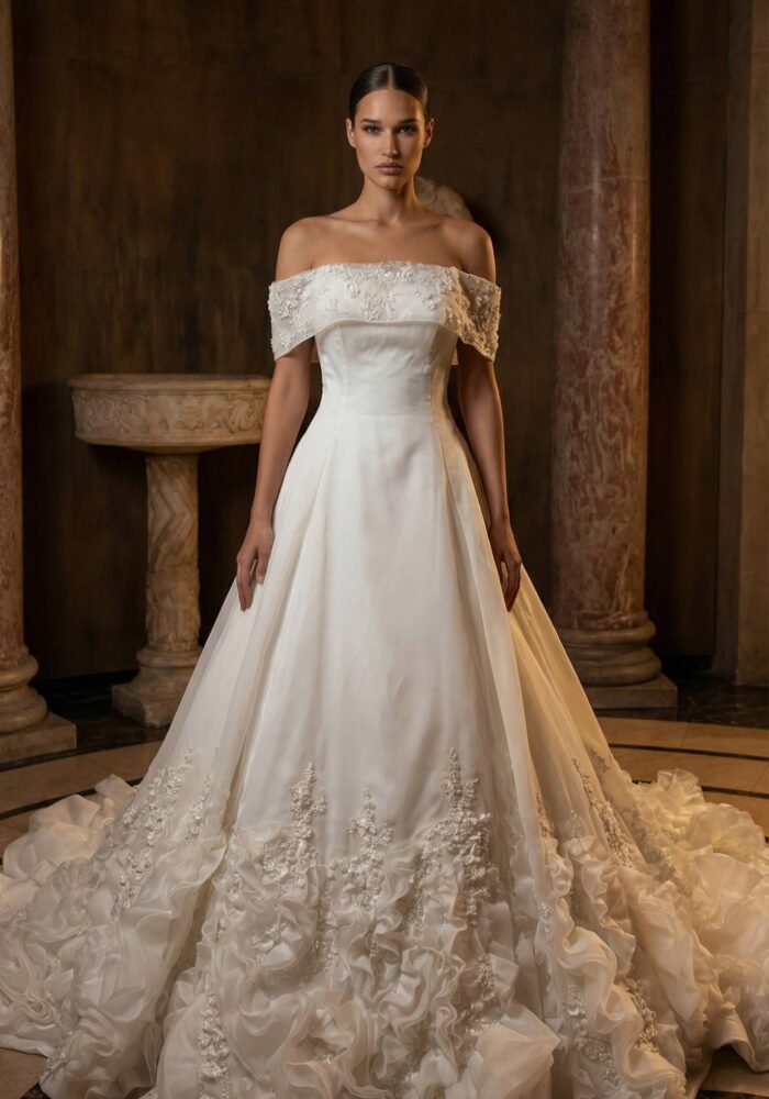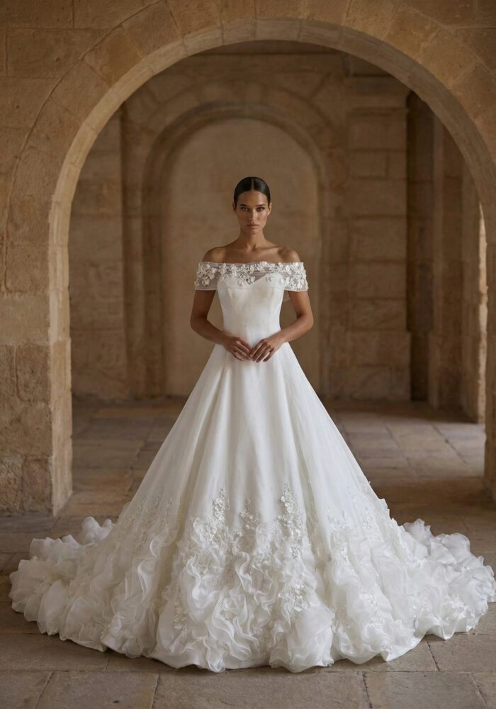 The heart of the collection. Defined by serene silhouette, where delicate shoulder detailing meets a flowing, luminous skirt. Embodies the feminine power and refined sensuality.